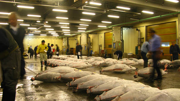 Tuna auction at Tsukiji market. We were allowed a glimpse of the daily transaction of the auctioning of at least 100 Bluefin (endangered) tuna carcasses....cut to almost look like missiles . These fish were brought in from different parts of the globe as most Bluefin are no longer found in Japanese waters. A similar scene enacts itself out in other major cities in Japan everyday. At this rate, with the Japanese appetite for fish, I'm not too optimistic about the future of these creatures. Tokyo, Japan, 2009